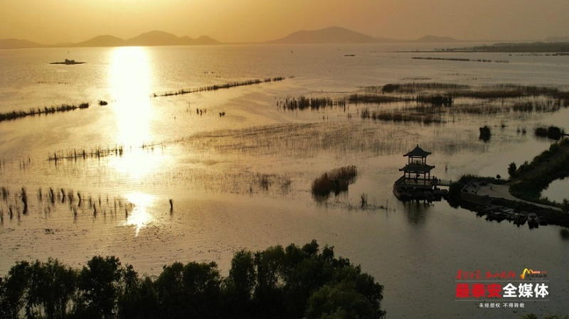 在夕阳余晖的映衬下,东平湖面金光闪烁,波光粼粼,乘一叶扁舟,在湖中畅游,看飞鸟掠过水面,看晚霞染红天边,湖边美景尽收眼底。