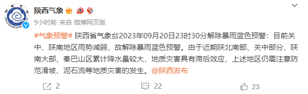 陕西省气象台2023年09月20日23时30分解除暴雨蓝色预警 :目前关中、陕南地区雨势减弱,故解除暴雨蓝色预警。由于近期陕北南部、关中部分、陕南大部、秦巴山区累计降水量较大,地质灾害具有滞后效应,上述地区仍需注意防范滑坡、泥石流等地质灾害的发生 。