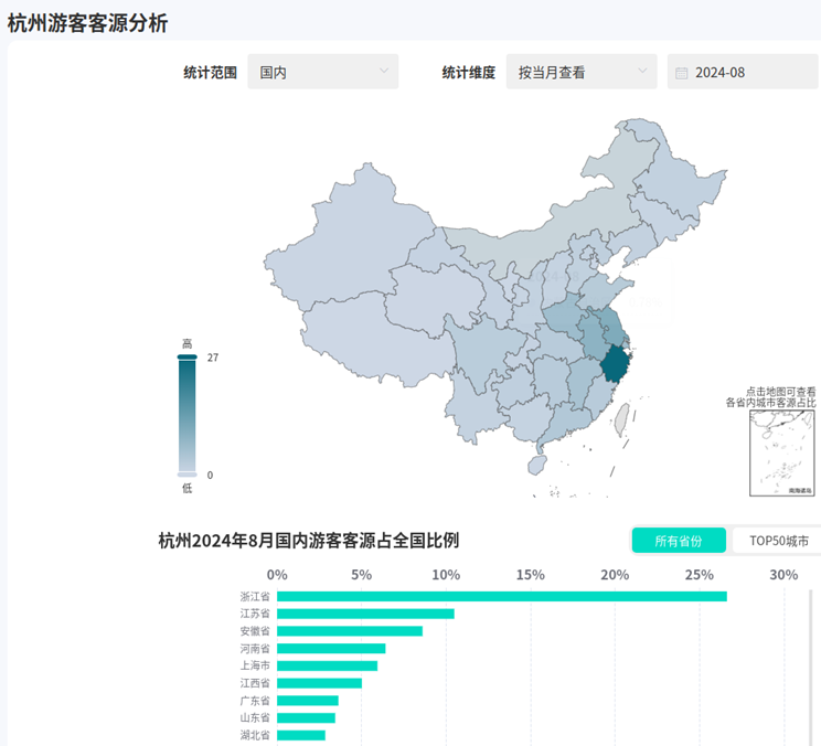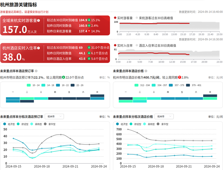 为方便游客在线查询,杭州文化和旅游数据平台还推出高峰预警H5,通过实时更新的全域/景区客流、酒店入住率和预订率等数据,指导游客前往客流较小的景区、提前预订酒店,提升假日期间的旅游接待能力。