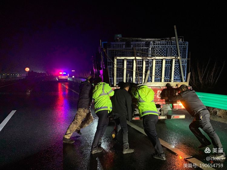 在除雪保畅中,一辆厢式货车突发故障,斜停在二车道与应急车道中间,情况危险,民警立即上前查看。在做好防护的同时,警民齐手将故障车及时推到应急车道并及时进行救援,驾乘人员连连称谢。