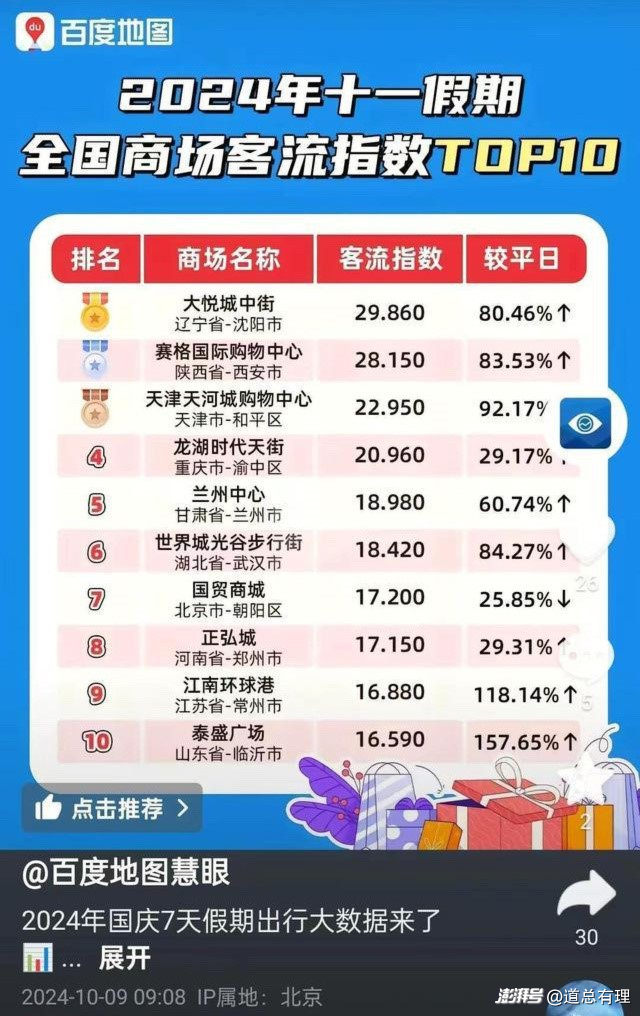今年10月6日,高德导航显示当天到达次数,临沂市泰盛广场高达11.3 万人导航到达,几乎是其他几家之和。而“百度地图”发布的国庆期间全国商场客流指数排名榜,榜首是沈阳的中街大悦城,身处三线城市临沂的泰盛广场,和其他节假日的表现一样,赫然在全国前十名里。