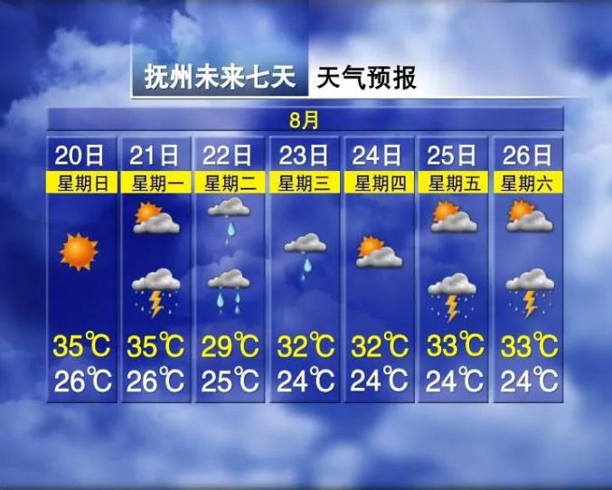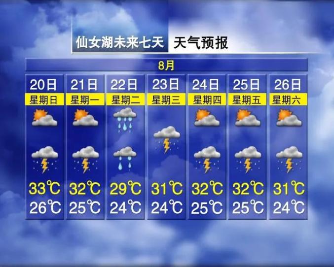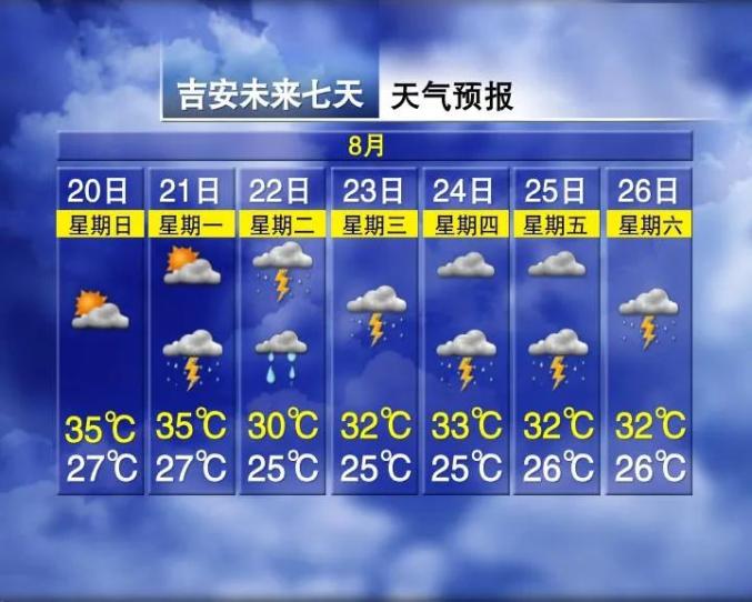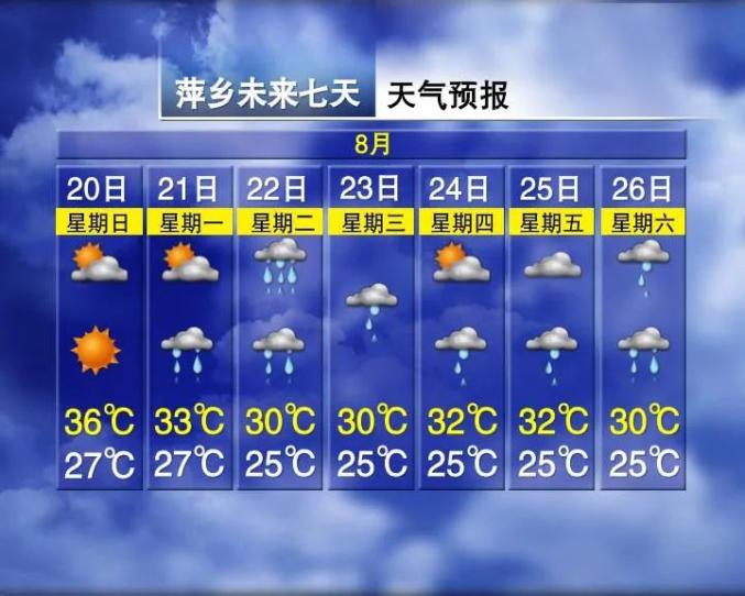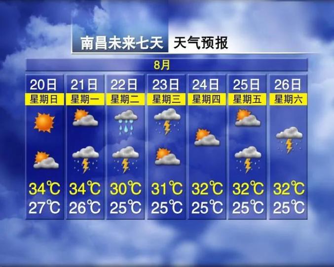 赣东北、赣中和赣南多云间阴天,部分地区有阵雨或雷阵雨;全省其他地区晴天多云,局部地区午后到傍晚有阵雨或雷阵雨。明天最低温度:全省25~27℃。