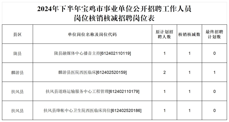 根据《2024年下半年宝鸡市事业单位公开招聘工作人员公告》规定,对未达到规定开考比例的,招聘计划数予以核销或核减。现将有关岗位核销、核减和最终招聘岗位计划情况予以公告。