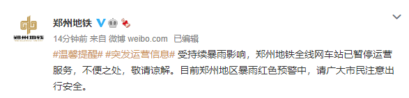 郑州地铁发布提醒,受持续暴雨影响,郑州地铁全线网车站已暂停运营服务。