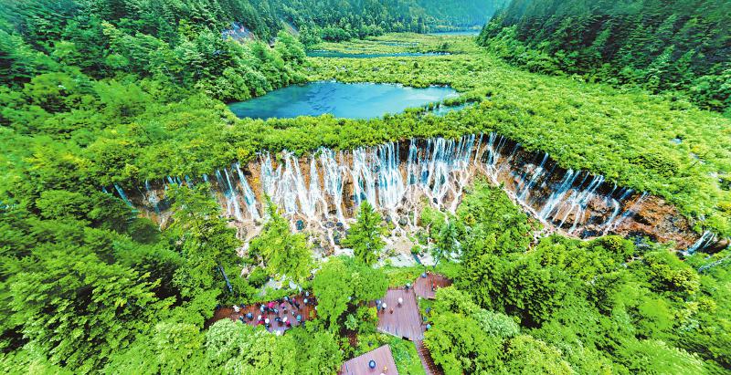 5月29日,空中俯瞰九寨沟景区,诺日朗瀑布宛如一幅壮阔的画卷。李旭 摄(C视觉)