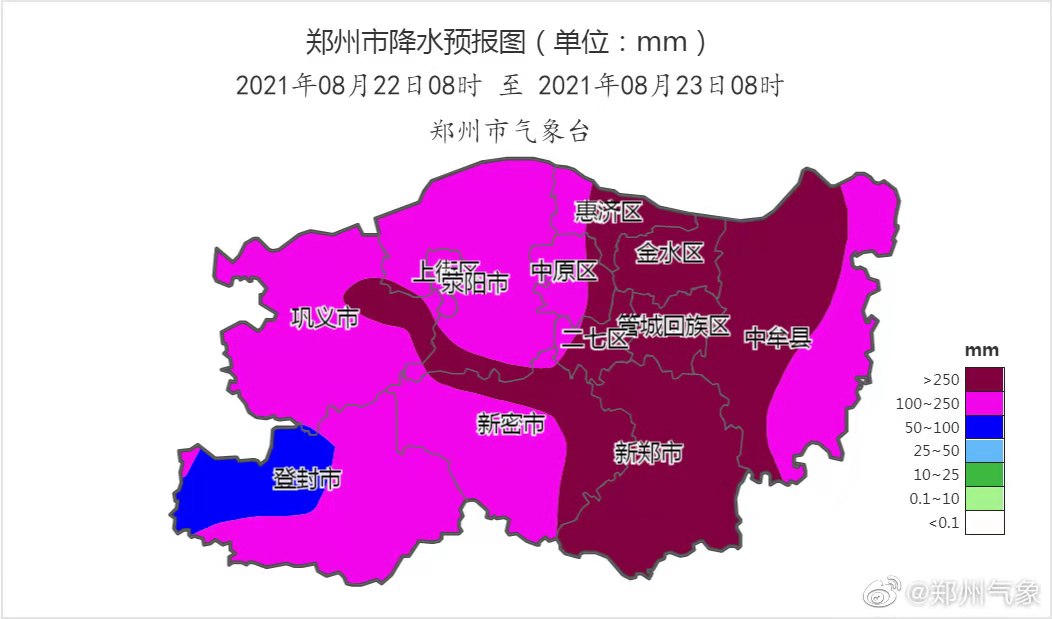 另据郑州发布,郑州市气象台2021年08月22日02时12分发布暴雨蓝色预警信号:预计未来12小时内,郑州市区、巩义、登封、荥阳、新密、新郑、中牟降水量将达50毫米以上,局地可达100毫米以上。请注意防范。