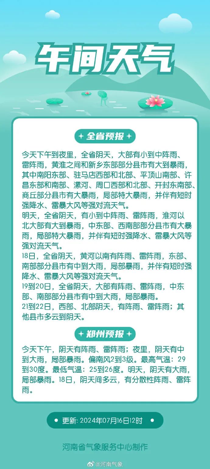 据@河南气象 预报,今天下午到夜里,全省阴天,大部有小到中阵雨、雷阵雨,黄淮之间和新乡东部部分县市有大到暴雨,其中南阳东部、驻马店西部和北部、平顶山南部、许昌东部和南部、漯河、周口西部和北部、开封东南部、商丘部分县市有大暴雨,局部特大暴雨,并伴有短时强降水、雷暴大风等强对流天气。
