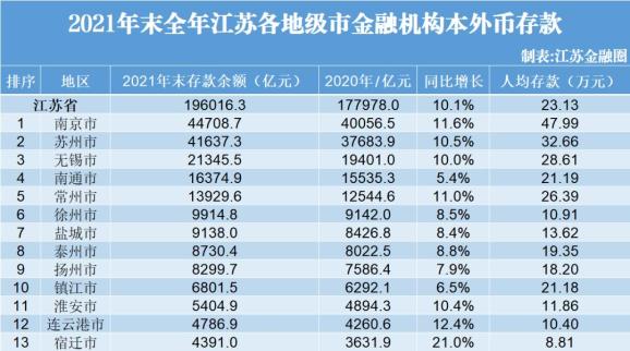 数据显示,截至2021年12月末,江苏省金融机构本外币存款余额为19.6万亿元人民币,较2020年末增长10.1%。其中住户存款本外币余额为7.4952万亿。