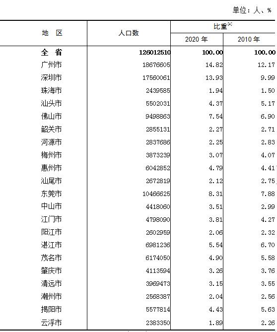 原标题:《广东省第七次全国人口普查公报[1](第二号) ——地区人口情况》