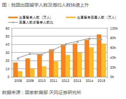 我国留学及回国人数逐年递增,近十年来留学回国人数CAGR达到28.5%。从1978年到2015年,中国各类出国留学人员累计达404.21万人,其中221.86万人回国发展,占已完成学业群体的79.87%。