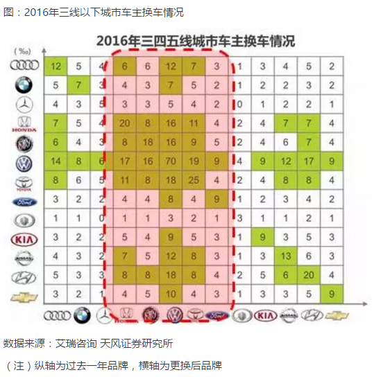 从二次购买的换车情况看,三线以下城市中更换为中端品牌的比例最高,其中低端品牌车主换车首选升级中端品牌。