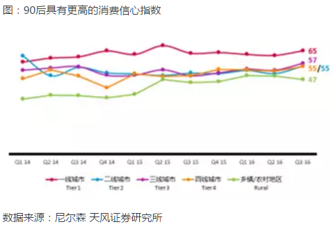 分城市来看,三四线城市消费意愿在16年底呈现增长趋势,甚至已经追平、超过了二线城市的消费意愿水平。传统的三、四线城镇青年受到示范效应带动,显示出了比以往更强的消费意愿水平。