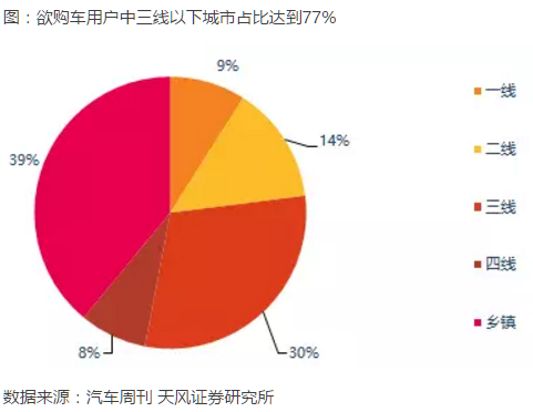 三四线城市汽车消费潜在意愿远超一二线城市。从购买意愿的角度看,初步完成城镇化建设的三四线城市居民对私家车的需求也进入爆发期。庞大的城市基数和购车人群代表着未来三四线广阔的购车市场。根据汽车周刊2016年的统计报告,未来一年欲购车用户中三线以下城市占比达到77%,远超一二线城市。