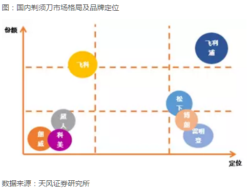 以剃须刀产品为例,目前国内的高端市场主要品牌包括飞利浦、松下、雷明登、博朗等,低端市场品牌包括奔腾、超人、科美等品牌,价格段在200元~400元的中端市场品牌较为匮乏。
