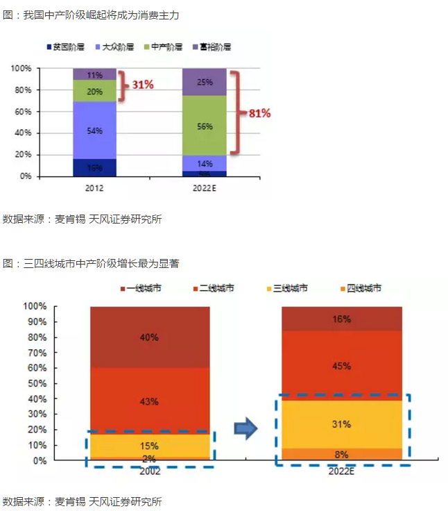 根据麦肯锡的数据预测,未来十年,中国城市家庭消费中产阶级及以上占比将大幅度提升,预计2022年达到81%,成为中国消费升级的最主要贡献。其中,三四线城市的中产阶级将成为未来占比增长最快的群体。
