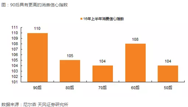 从消费信心指数看,90后年龄群体的消费信心指数明显高于其他年龄段。作为富有个性的消费群体,90后群体购物的态度更加开放,喜欢尝鲜,有着更强烈的消费意愿。