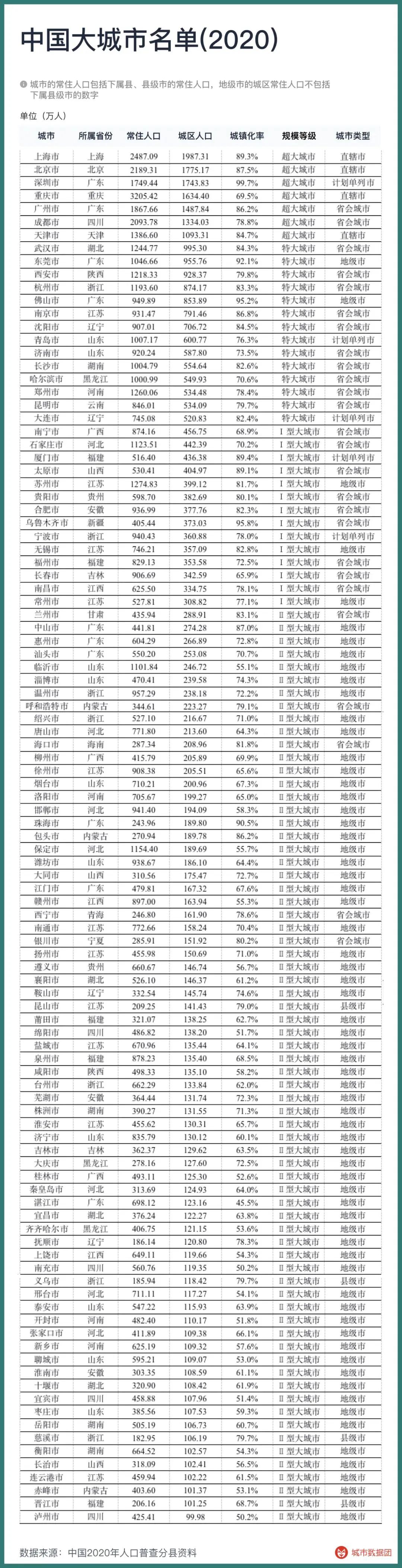 最新的数据是2022年国家统计局刊印的《2020中国人口普查分县资料》,公布了105个大城市名单。