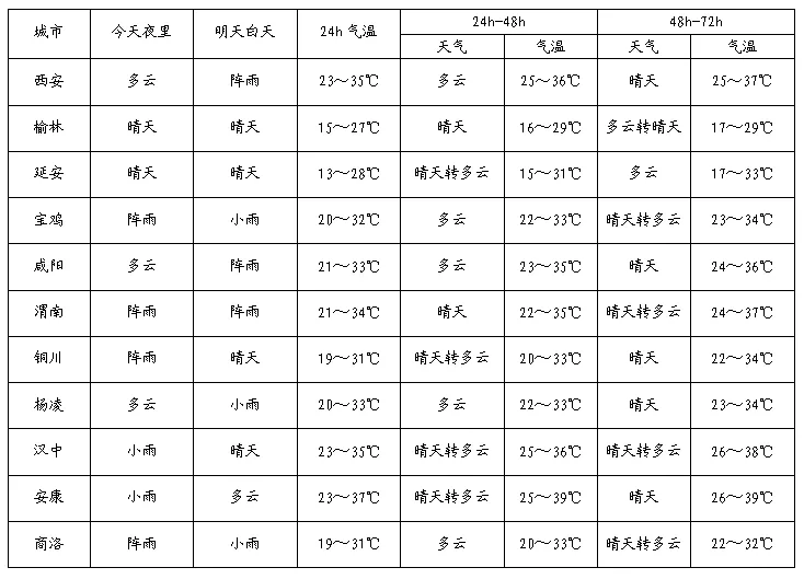 明天白天:全省晴天间多云,陕北部分、关中部分、陕南大部有分散性阵雨或雷阵雨(0.1-10mm)。关中东部局地、陕南南部河谷地区有35℃以上的高温天气。