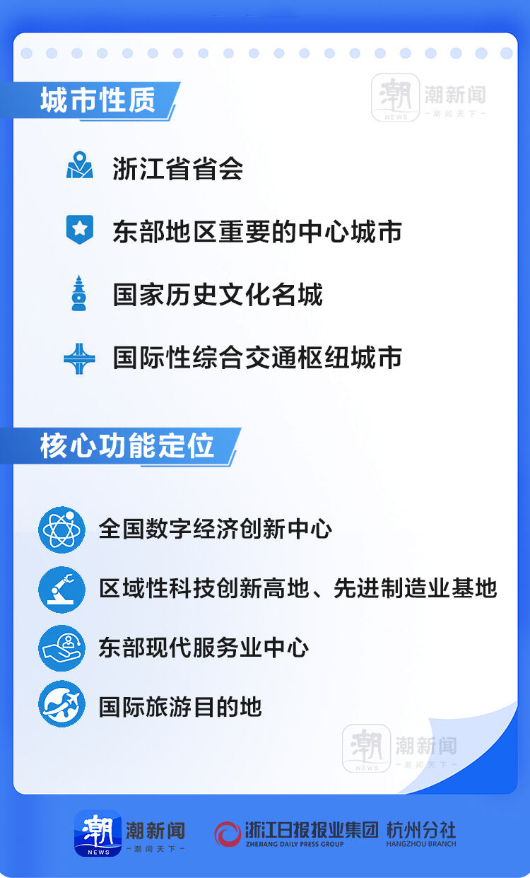 作为首部覆盖杭州全域全要素“多规合一”的国土空间总体规划,从内容来看,无论是城市性质,还是核心功能,相较之前都有明显提升,站在更高维度为杭州的城市发展“施工图”架好了“四梁八柱”。
