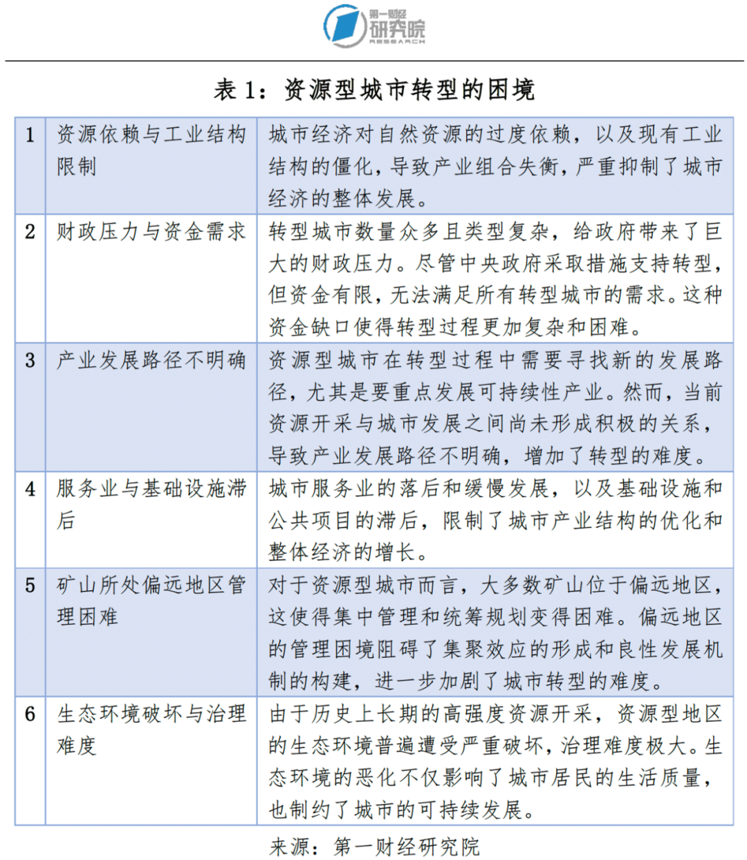 在实际转型过程中,资源型城市普遍面临的挑战大致可以分为六种:资源依赖、财政资金短缺、产业路径模糊、服务设施滞后、矿山所处偏远地区管理困难以及生态环境恶化。