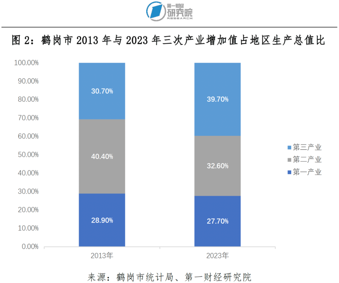 从近十年的GDP总量来看,根据鹤岗市统计局提供的数据,2014年277.6亿元是近十年来的最低点,然后逐年增长,2023年鹤岗市GDP为383.6亿元,比2014年增加106亿元,累计增长38.2%。2023年,三次产业之比为27.7:32.6:39.7,第一产业增加值近十多年来变化不大,第二产业基于受到煤炭开采和洗选业的影响,占地区生产总值比下降,第三产业占比则上升。总体来看,三次产业结构十年间发生的变化主要是在第二产业与第三产业之间。