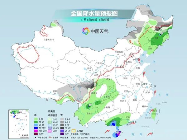 11月3日08时至11月4日08时,内蒙古东部、黑龙江大部、川西高原、西藏东南部、新疆北部等地部分地区有小到中雪或雨夹雪,其中,黑龙江中东部、川西高原东北部等地部分地区有大到暴雪。黑龙江东南部、吉林中东部、辽宁北部、四川南部、广西南部、雷州半岛和海南岛等地部分地区有中到大雨,其中,广西南部沿海、海南岛中东部等地部分地区有暴雨或大暴雨。