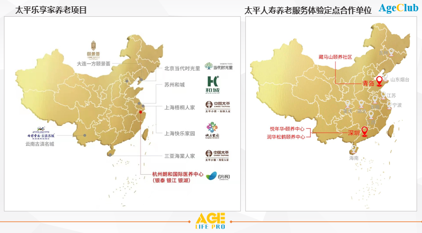太平人寿布局的养老社区上海·太平梧桐人家和太平小镇·海棠人家现已开业。此外,太平合作的项目有上海·快乐家园、宁波·星健兰亭、大连·一方颐景荟、昆明·古滇名城、北京·当代时光里;