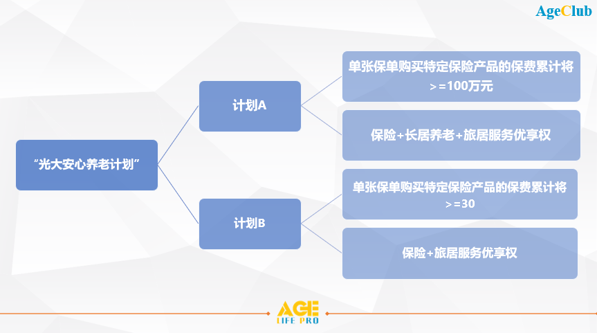 计划A通过“保险+长居养老+旅居养老服务优享权”服务于中高端客户,为客户提前锁定光大养老社区的入住权,入住权更细分为“保证入住权、优先入住权、价格优惠权、体验入住权”等,为客户提供更多、更明确的保障,权益人最高可达六人,不仅包括客户及其配偶,还扩展到双方父母。另外,权益人还可以自投保之日起享受一年四季、全国各地、价格优惠的旅居养老服务;