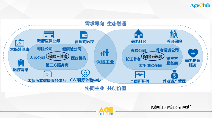 同样,太保养老转型2.0的重要方向之一,就是致力于打造“保险+健康+养老”生态圈。其中,“太保蓝本”医疗服务、“太保妙健康”健康互动计划、“CWI健康体检中心”构成了“保险+健康”生态圈;而通过旗下的寿险公司、养老投资公司、长江养老,以及与太平洋欧葆庭、第三方服务商合作,构成了“保险+养老”生态圈。这两个生态圈可协同保险主业,实现生态融通。
