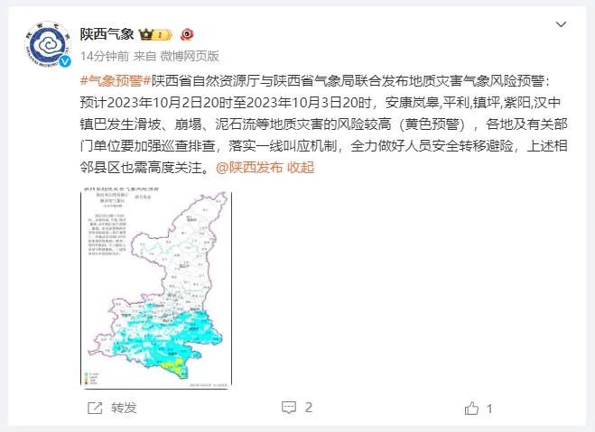 预计2023年10月2日20时至2023年10月3日20时,安康岚皋、平利、镇坪、紫阳,汉中镇巴发生滑坡、崩塌、泥石流等地质灾害的风险较高(黄色预警),各地及有关部门单位要加强巡查排查,落实一线叫应机制,全力做好人员安全转移避险,上述相邻县区也需高度关注。