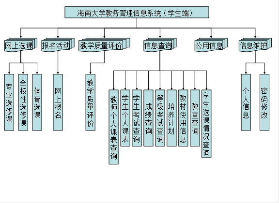 海南大学教务管理信息系统的功能主要是保障日常教学任务的正常开展。教师子系统可以实现教师排课,教学任务规划,教师课程表,学生成绩登入,等功能。学生子系统可以实现学生信息录入管理,学生选课与课程安排,学习成绩查询,学习培养计划,网上教师评价,网上报名等功能。日常访客子系统可以了解学校教学进度等功能。管理员子系统则可后台实现对教务管理系统的运行和维护,及时录入信息,持续保持系统的正常运行。