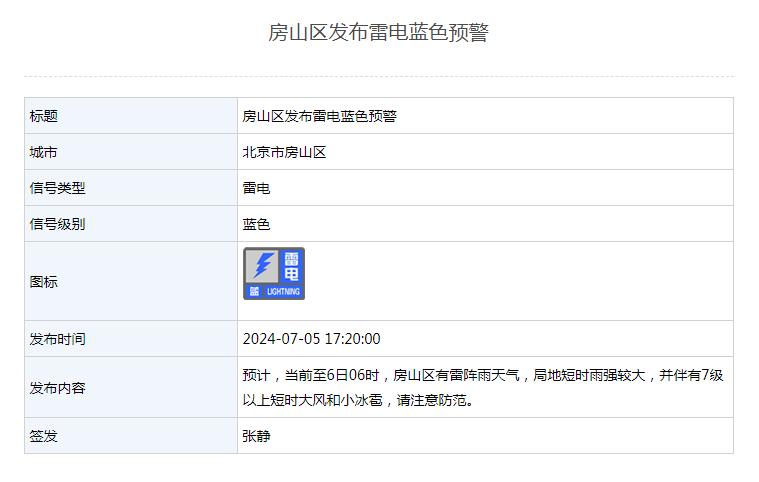 预计,当前至6日06时,房山区有雷阵雨天气,局地短时雨强较大,并伴有7级以上短时大风和小冰雹,请注意防范。