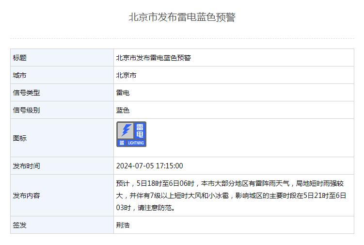 预计,5日18时至6日06时,本市大部分地区有雷阵雨天气,局地短时雨强较大,并伴有7级以上短时大风和小冰雹,影响城区的主要时段在5日21时至6日03时,请注意防范。