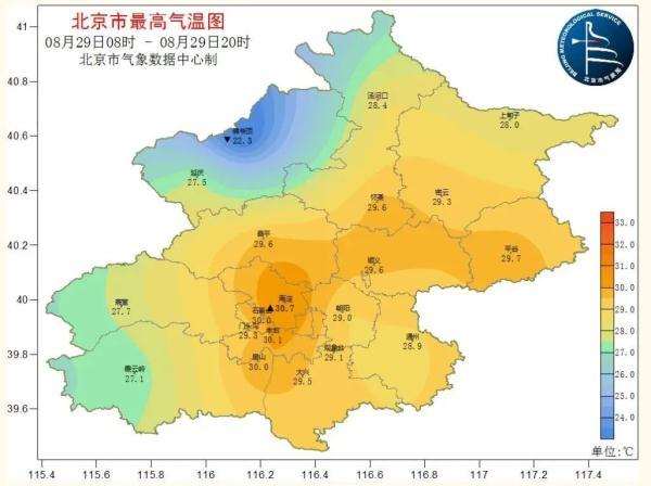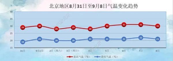 预计南郊观象台从8月31日到9月8日最高气温28~31℃,最低气温19~22℃。