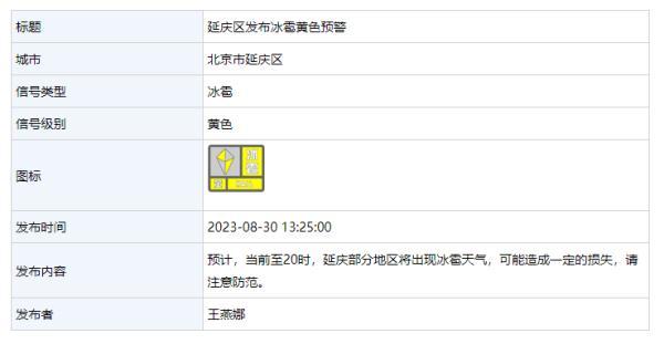 冰雹黄色预警:预计,当前至20时,延庆部分地区将出现冰雹天气,可能造成一定的损失,请注意防范。