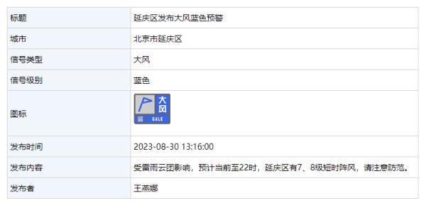 大风蓝色预警:受雷雨云团影响,预计当前至22时,延庆区有7、8级短时阵风,请注意防范。
