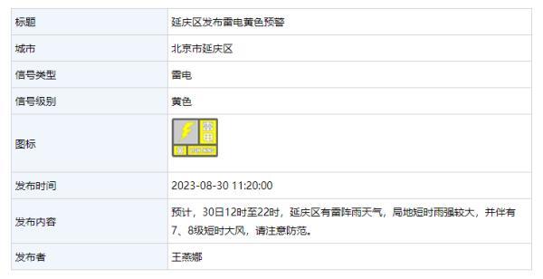 北京市气象局消息,8月30日,北京延庆区连续发布雷电黄色预警、大风蓝色预警和冰雹黄色预警。雷电黄色预警:预计,30日12时至22时,延庆区有雷阵雨天气,局地短时雨强较大,并伴有7、8级短时大风,请注意防范。