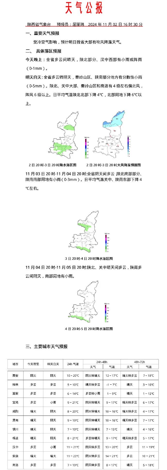 明天白天:全省多云转阴天,秦岭山区、陕南部分地方有分散性小雨(0-5mm)。陕北、关中大部、秦岭山区和商洛有4级左右偏北风,阵风6级以上。日平均气温陕北北部下降4℃,北部局地下降6℃以上。