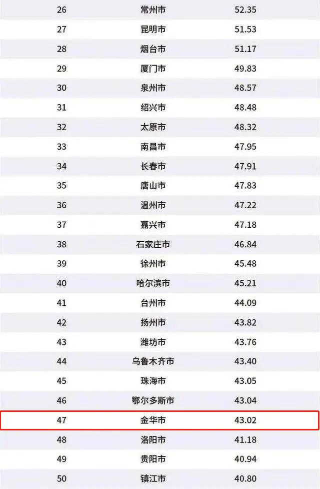 由华顿经济研究院编制的“2020年中国百强城市排行榜”日前在上海发布,金华以综合分值43.02分,排全国第47位。