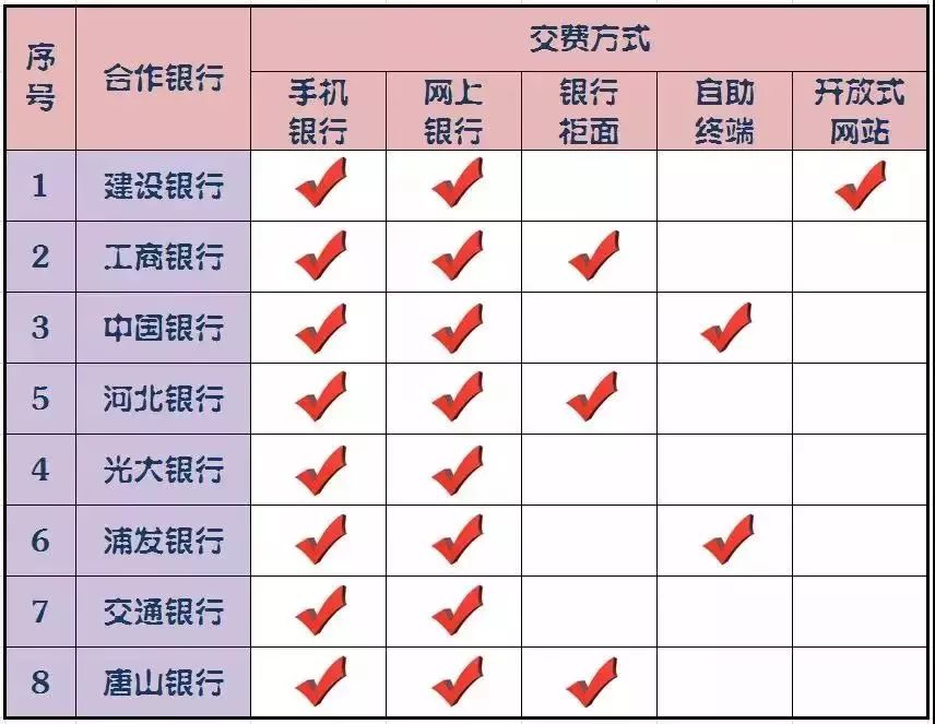 2.在各联网收费银行缴费,联网银行及缴费方式在下表: