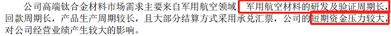 据西部超导财报披露,其高端钛合金材料市场需求主要来自军用航空领域,军用航空材料的研发及验证周期长,回款周期长,产品生产周期较长,且大部分结算方式采用承兑汇票,导致企业短期资金压力较大。