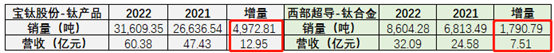 首先,从规模来看,宝钛股份无论是军用、还是整体规模,都远超西部超导。而且,2021-2022年,宝钛股份的钛产品销量增长4972.81吨,营收增长12.95亿;而西部超导的钛合金销量增长1790.79吨,营收增长7.51亿。
