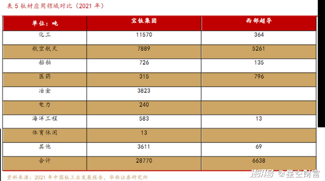 宝钛股份成立于1999年,所在地陕西省宝鸡市是中国最大的钛及钛合金生产科研基地,被誉为“中国钛谷”。宝钛股份所产钛材,既有军用,也有民用。同样对比2021年销量结构,其航空航天领域销售钛材7889吨,占比只有27%。