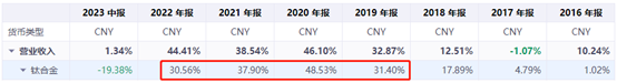 从过往数据来看,2016、2017年,西部超导钛合金收入增长只有1.02%、4.79%。而近几年国家对军用飞机的需求旺盛,西部超导基本维持了30%以上的收入增速。但是2023年上半年,钛合金收入掉头向下,同比降幅高达19.38%(由于宝钛股份业绩难以区分军工和民用,因此主要以西部超导数据为例,下同)。