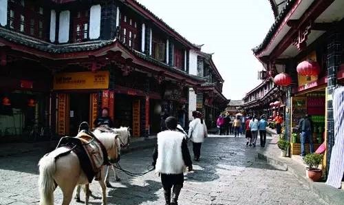 小时候,还常常见到一队队藏族马帮赶着打扮得光鲜漂亮的骡马穿梭往来于古城。领头的马或骡往往神气活现地戴着漂亮的头饰,上面有各种刺绣图案,中间嵌着一面明晃晃的镜子,脖颈上挂一个大铜铃。石板路上留下一串串铃声和马蹄声。此为“茶马古道”马帮的古风,既图吉祥,也是炫耀自己的马队。由于赶马汉子穿的是钉过铁钉的皮靴,马蹄上钉了铁掌,殊不知这是走丽江古城五花石板路的大忌,有时一不小心,就人仰马翻在那奇滑无比的五花石路面上,引起周围一片善意的哄笑声。