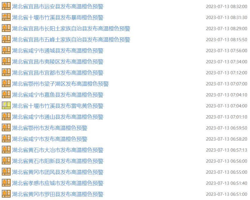 武汉中心气象台2023年7月13日6时35分发布高温橙色预警信号:预计今天白天,宜昌东部、荆州、孝感、武汉、黄冈、黄石、鄂州、咸宁、天门、潜江、仙桃最高气温将升至37℃以上,局部39℃以上,请注意防范。