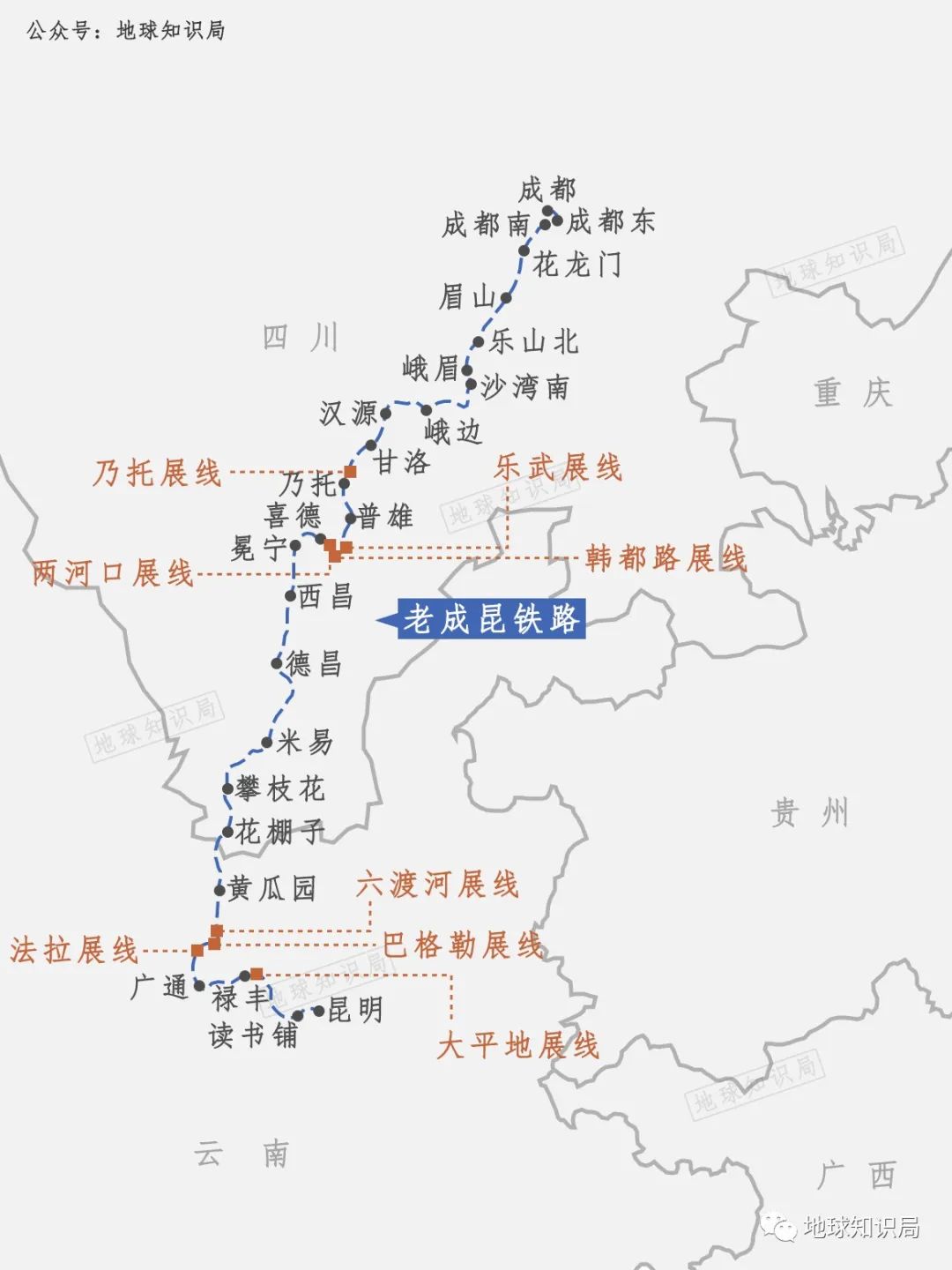 从成都至昆明方向,成昆铁路依次经过乃托、乐武、韩都路、两河口、六渡河、巴格勒、法拉、大平地8个展线,且多为几个马蹄型和螺旋型相结合的“复合型展线”。前4个展线在四川境内,后4个则处于云南境内。