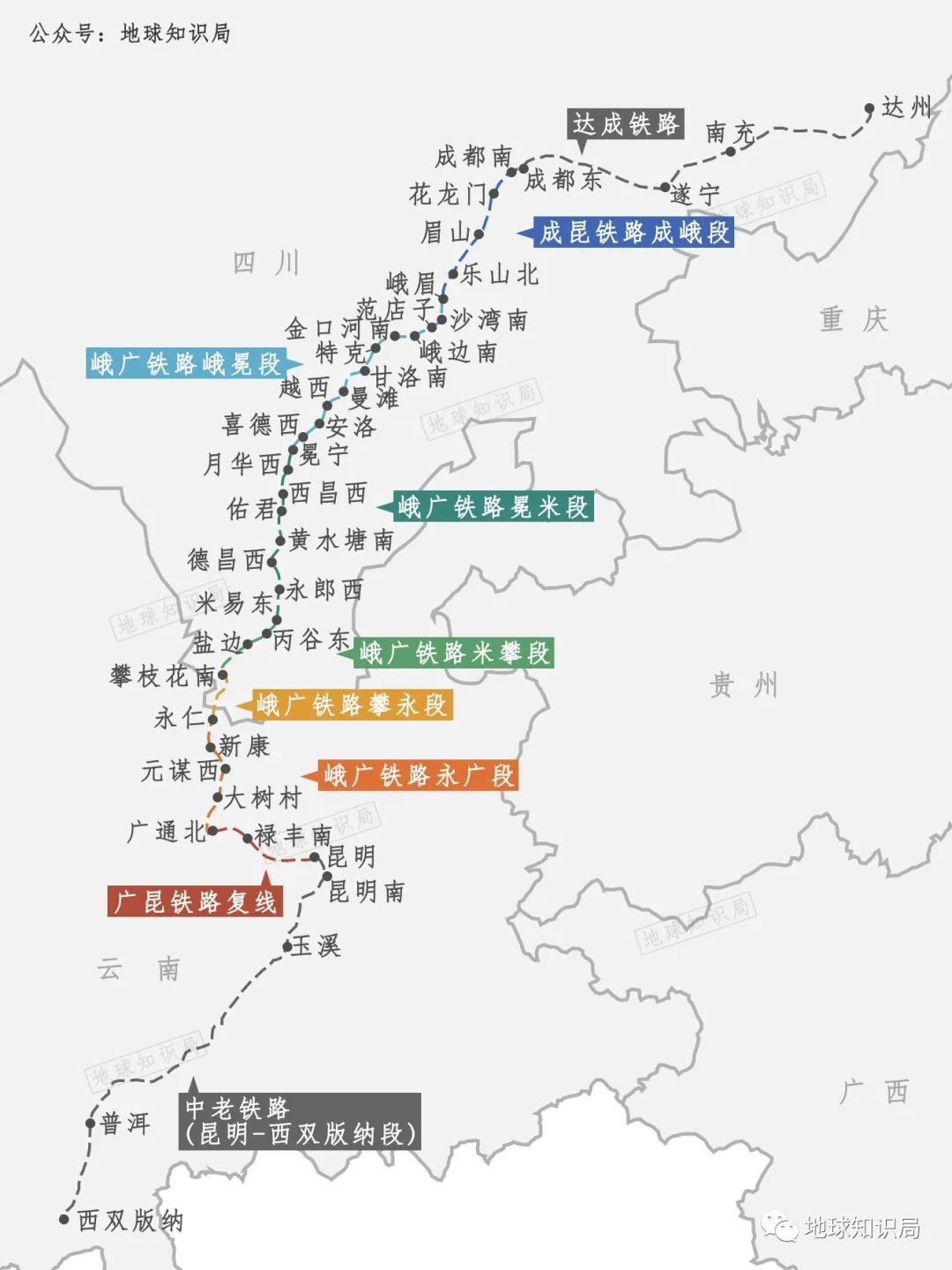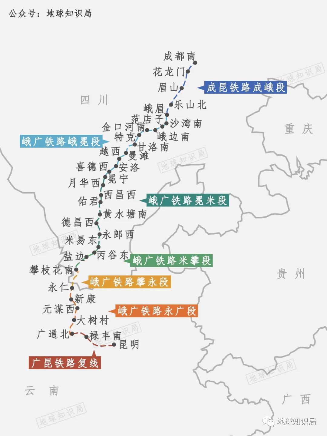由成昆铁路成峨段、峨广铁路、广昆铁路复线组成▼