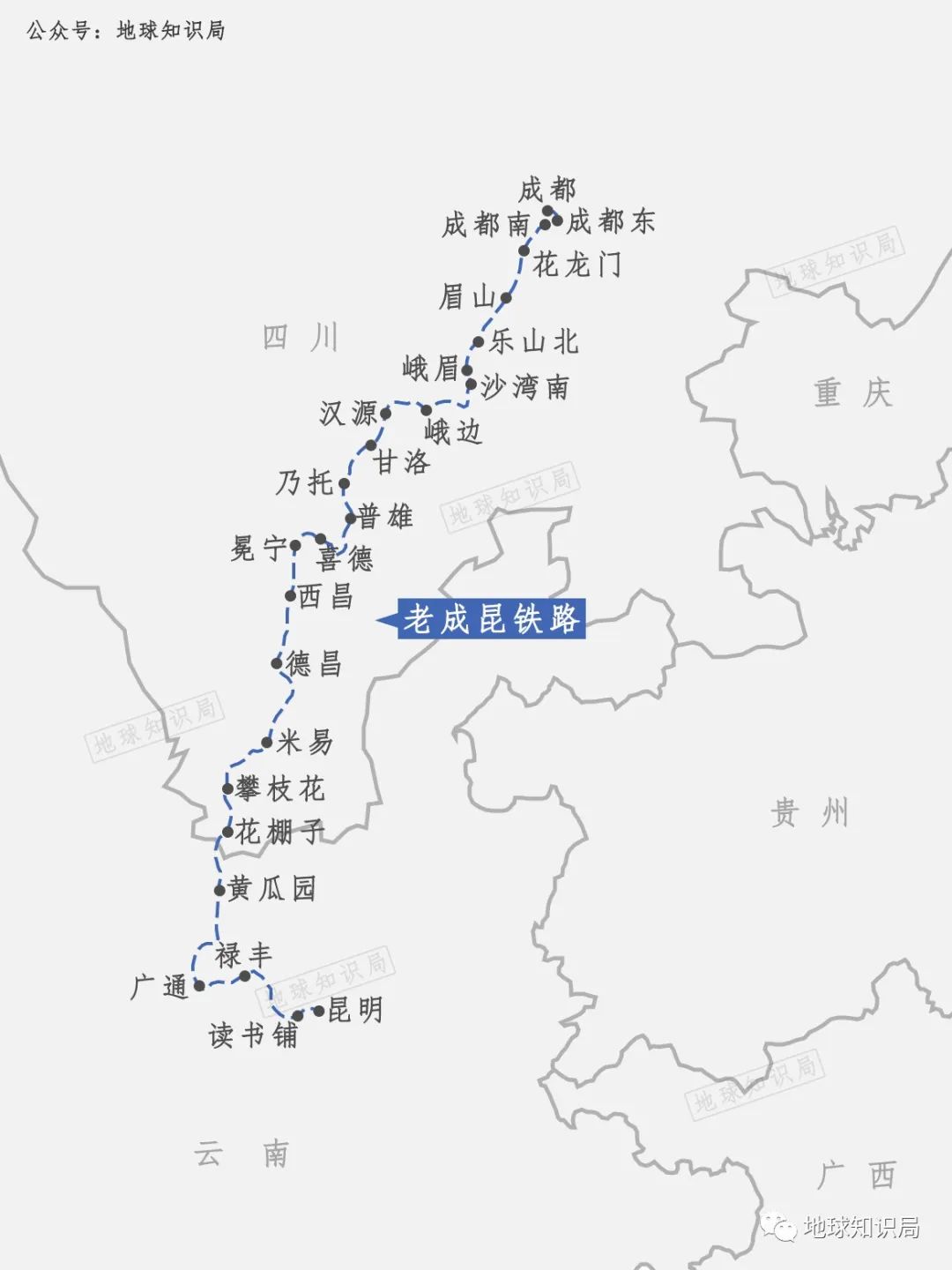 老成昆铁路于1958年7月开工建设,1970年7月1日建成通车,历时12年建成。由成都至昆明,全长1096公里,为国铁Ⅰ级单线铁路,设计时速80公里,行经四川盆地、横断山脉、云贵高原三大地理区块。