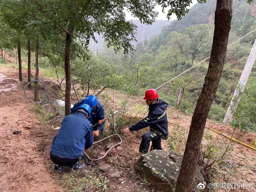 10月1日,国网韩城市供电公司人员抢修因连续下雨受损的电力线路。图片来源:国网陕西电力微博